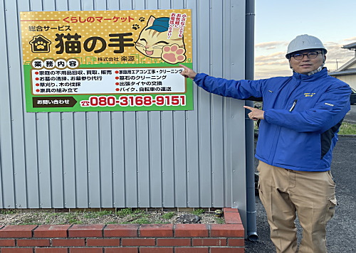 社名 総合サービス猫の手 株式会社 楽源 本社所在地 〒761-8032 香川県高松市鶴市町503-6 TEL. 080-3168-9151 資本金 100万円 資格 香川県 公安委員会 第811070002010号 軽貨物運送業 産業廃棄物収集運搬業許可番号 246178